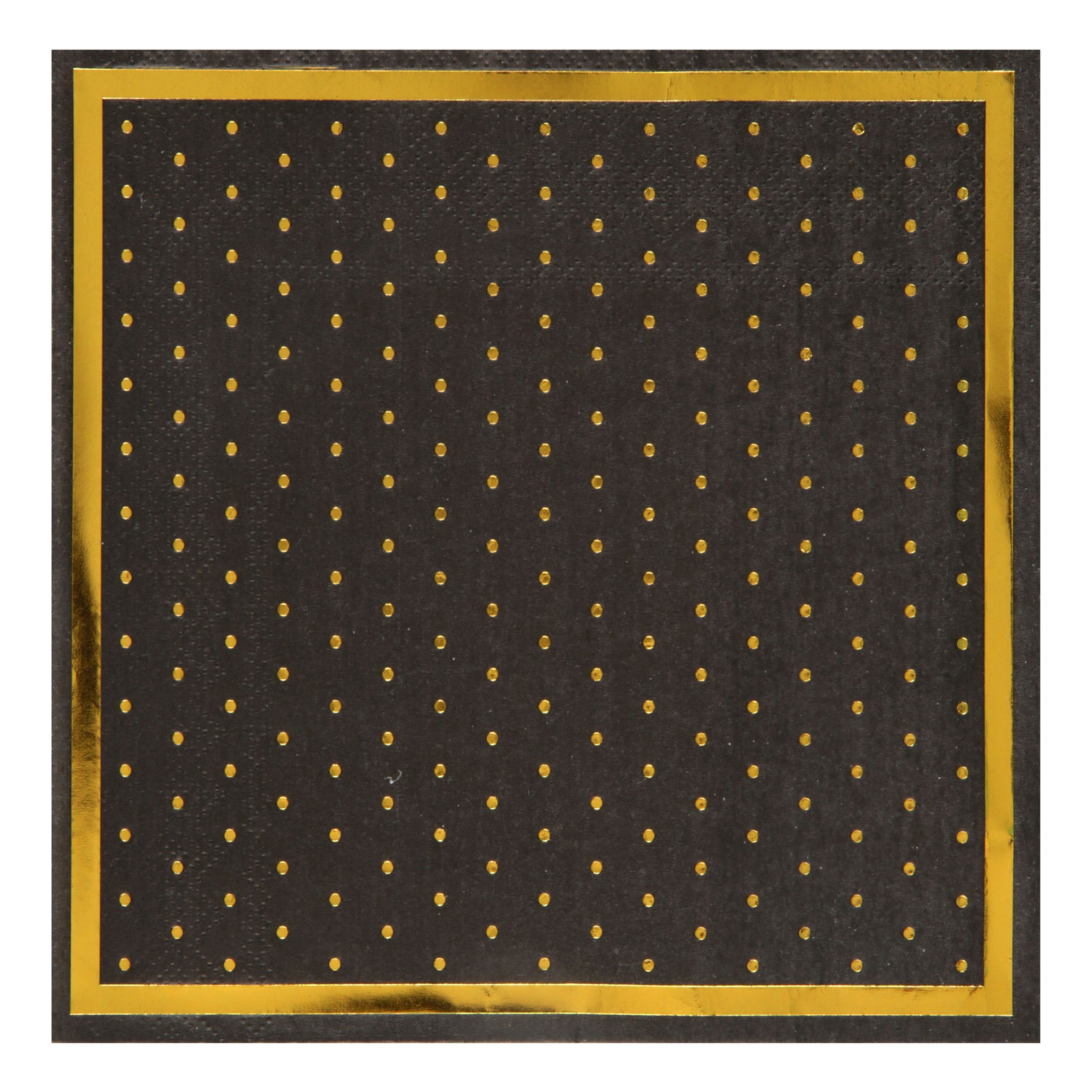 Servetter Prickiga Svart/Guld inkluderar tjugo stycken svarta servetter som kommer med guldskimrande prickar och guldskimrande bård runtom. Servetterna är vikta i tre lager och är vita på insidan.