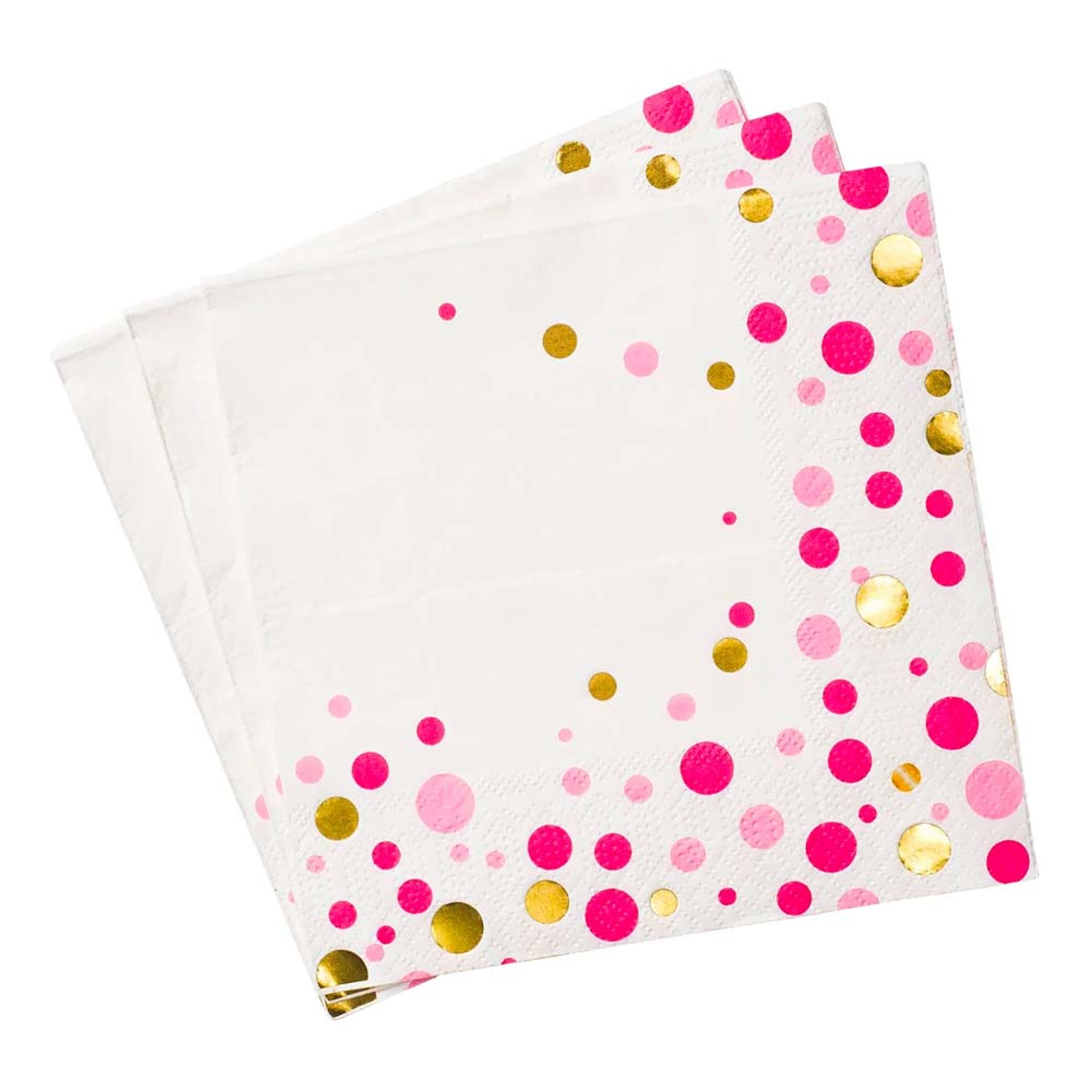 Servetter Rosa/Guld Prickar innehåller 16 stycken papperservetter med prickigt mönster i fina färger. Servetterna mäter 33 x 33 cm och kommer göra underverk på kladdiga kalas och blöta fester!