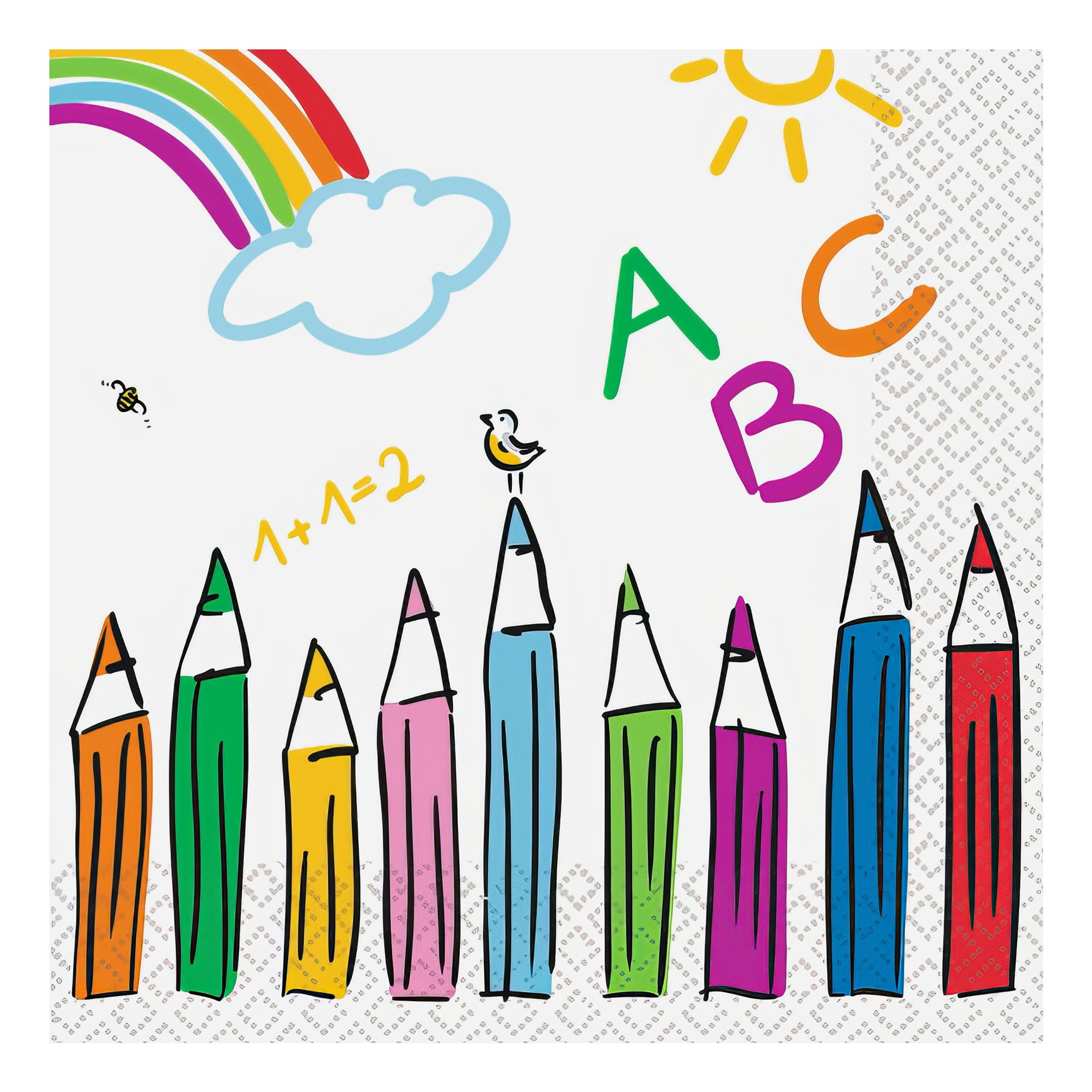 Servetter Skolstart inkluderar totalt tjugo stycken vita pappersservetter som kommer med ett färgglatt motiv föreställande pennor, bokstäver, mattetal och annat som för tankarna till skolan. Matcha gärna med annan dukning ur samma serie för ett komplett skolstart-tema.