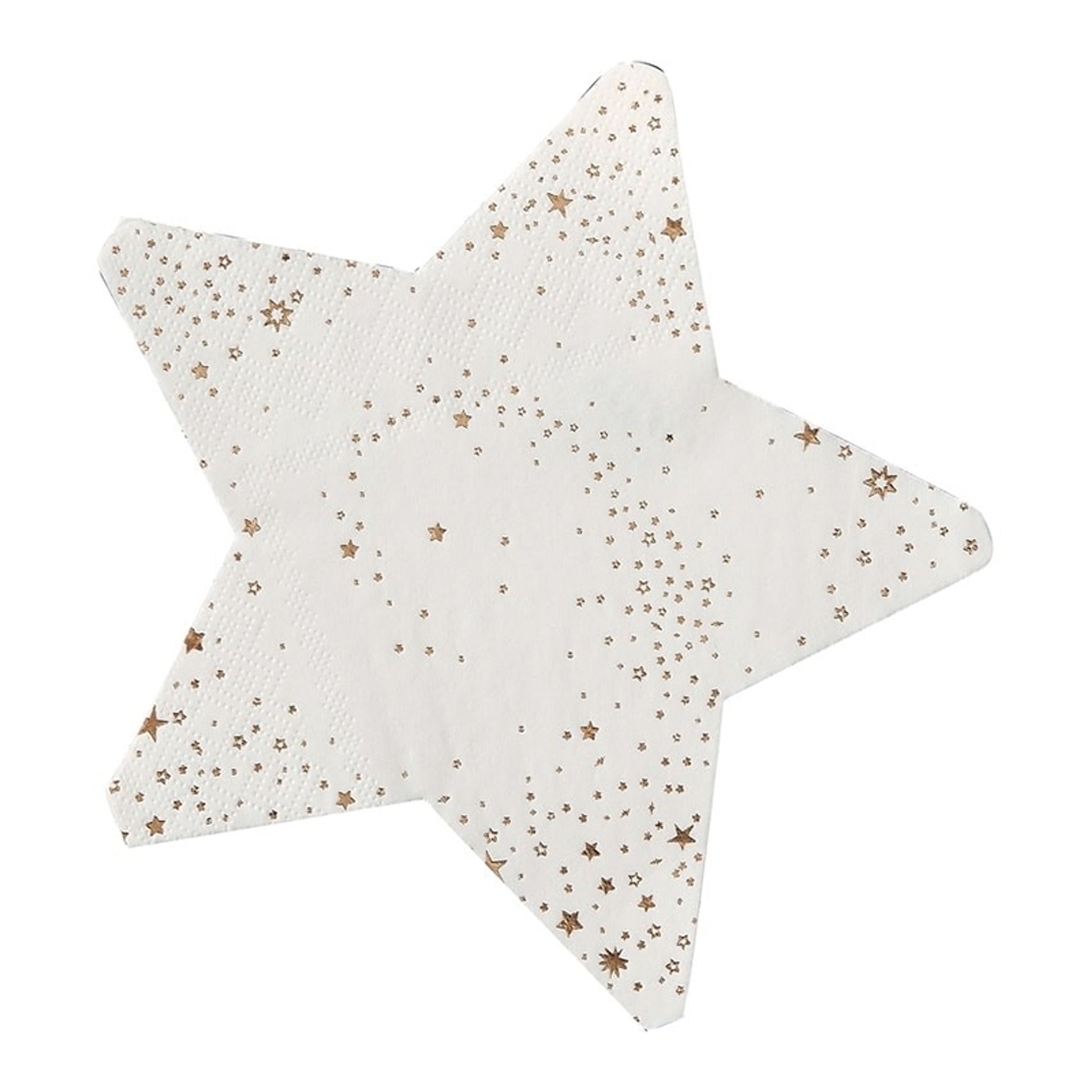 Servetter Stjärnor Vit/Guld levereras som ett 16-pack servetter i form av vitguldiga stjärnor. Varje servett mäter 17 x 17 cm stora och klassas som 2-lagers. Perfekt till jul eller nyår.