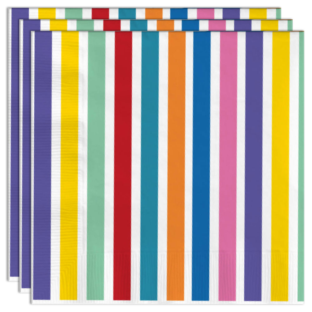 Servetter Stripes Color Pop omfattar ett 20-pack vita servetter med ränder i flera olika färger. Servetterna har tre lager och mäter ca 33 x 33 cm utvikta.