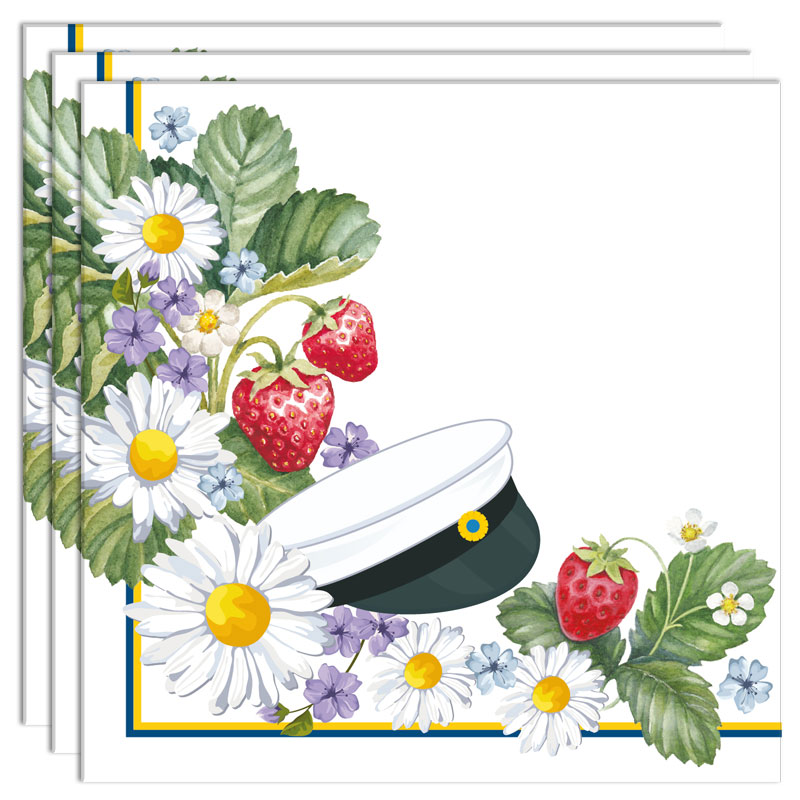 Servetter Studentmössa och Blommor omfattar vita servetter med motiv i form av en studentmössa med blommor och jordgubbar runtom samt blå och gul rand längs med två sidor. Servetterna är ca 33 x 33 cm utvikta och säljs i 20-pack.