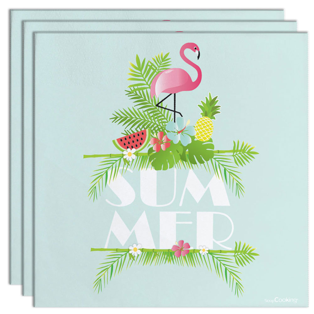 Servetter Summer omfattar servetter i ljusturkos med texten "Summer" i vitt och motiv av flamingo, frukter, blommor och växter i olika färger. Servetterna har tre lager papper och är ca 33 x 33 cm utvikta. Säljs i 20-pack.