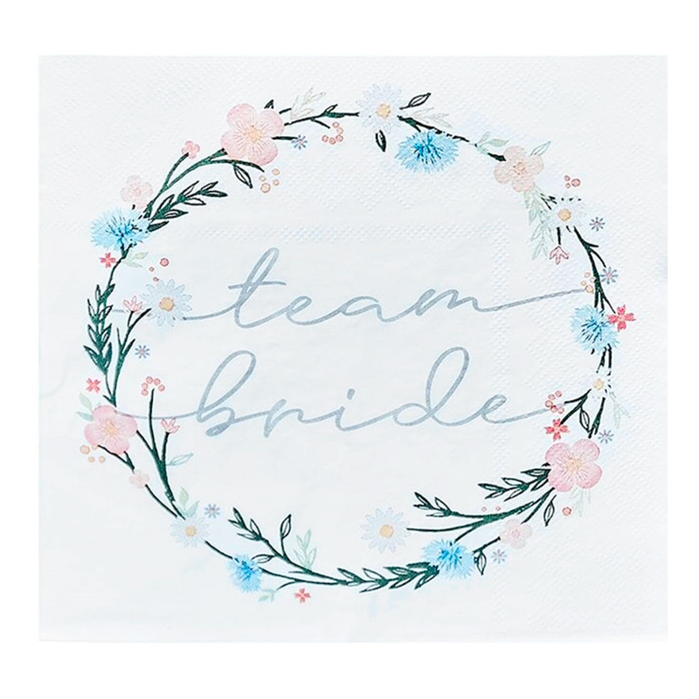 Servetter Team Bride Boho innehåller 16 stycken vita servetter med en tryckt blomkrans med texten "Team bride". Varje servett mäter 16,5 x 16,5 cm outvikt och 33 x 33 cm utvikt. Passar utmärkt till möhippan!