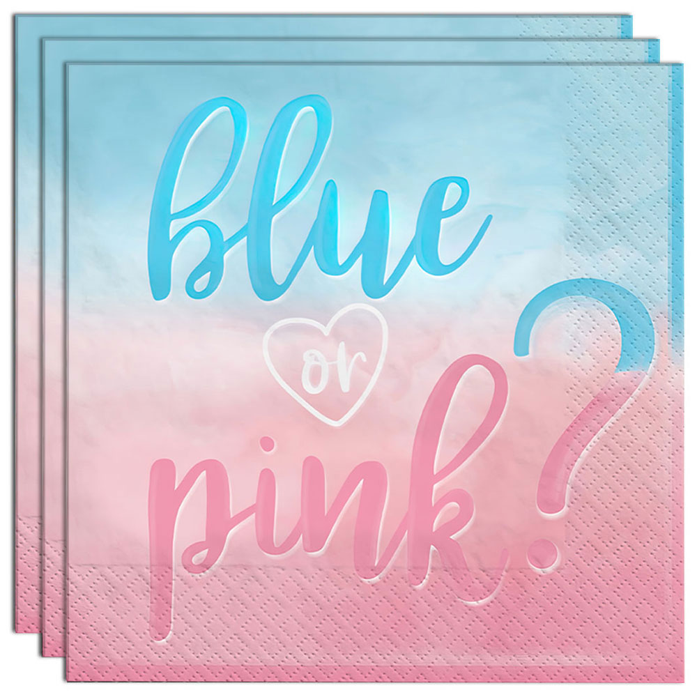 Servetter The Big Reveal omfattar 16 stycken ljusblåa och rosa pappersservetter med texten "Blue or Pink?". Servetterna har två lager och mäter ca 33 x 33 cm utvikta.