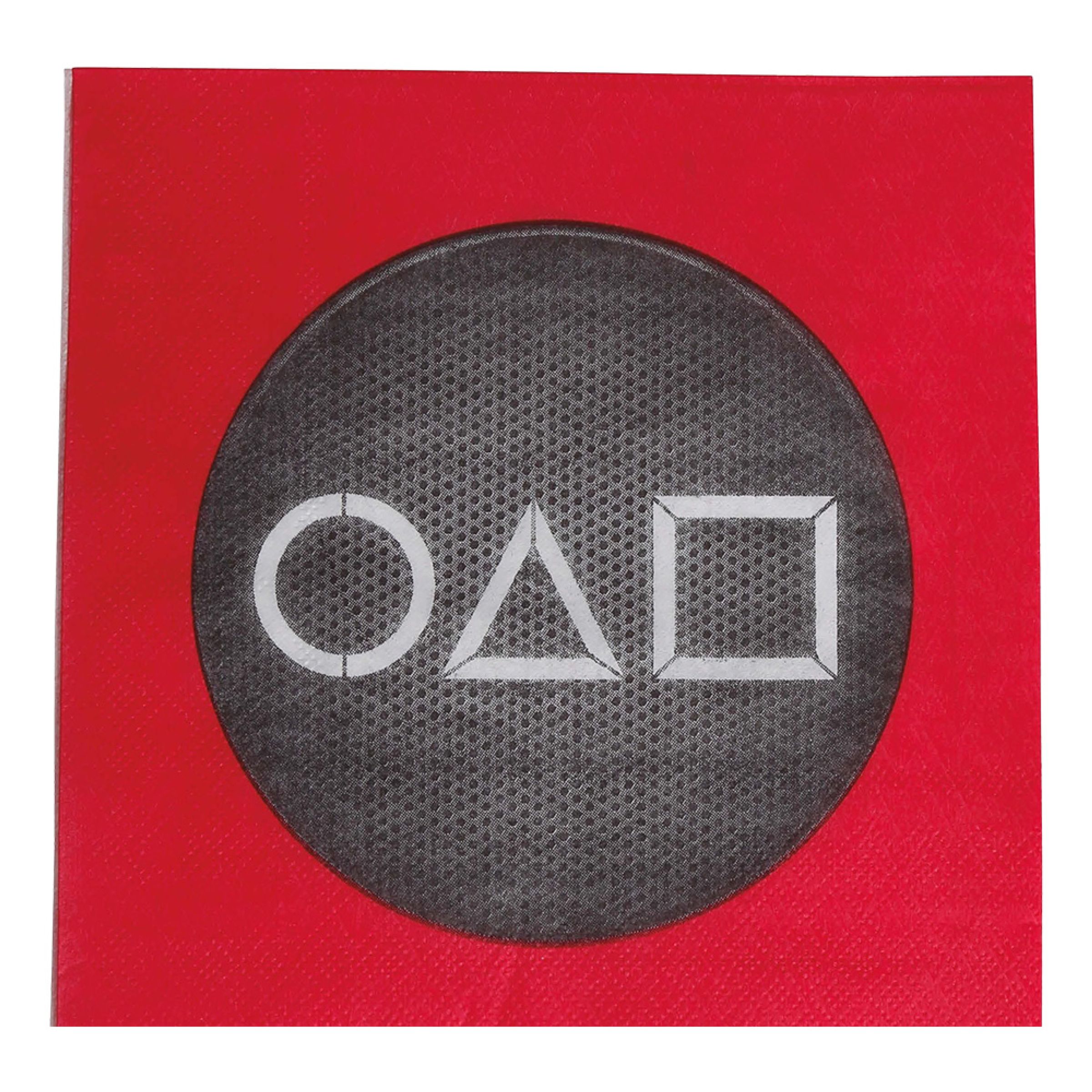 Servetter The Gamer inkluderar 20 stycken röda servetter med motiv av Squid Games klassiska ikoner: cirkeln, triangeln och kvadraten. Servetterna har två lager och kommer med tryck på alla sidor.