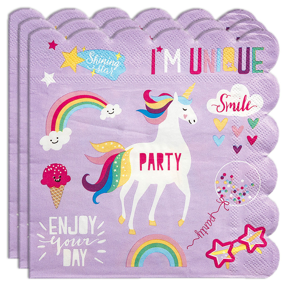 Servetter Unique Unicorn omfattar ett 16-pack lila servetter av papp med fina motiv av en enhörning, hjärtan, regnbågar, stjärnor och olika texter. Servetterna mäter ca 33 x 33 cm utvikta.