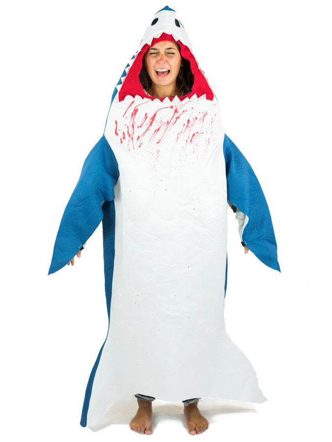 Shark Attack Hajdräkt består av en blå-vit hajdräkt med öppen, blodig mun. Öppningar för armar och ben finns, samt i hajens blodiga gap finns öppning för ansiktet.