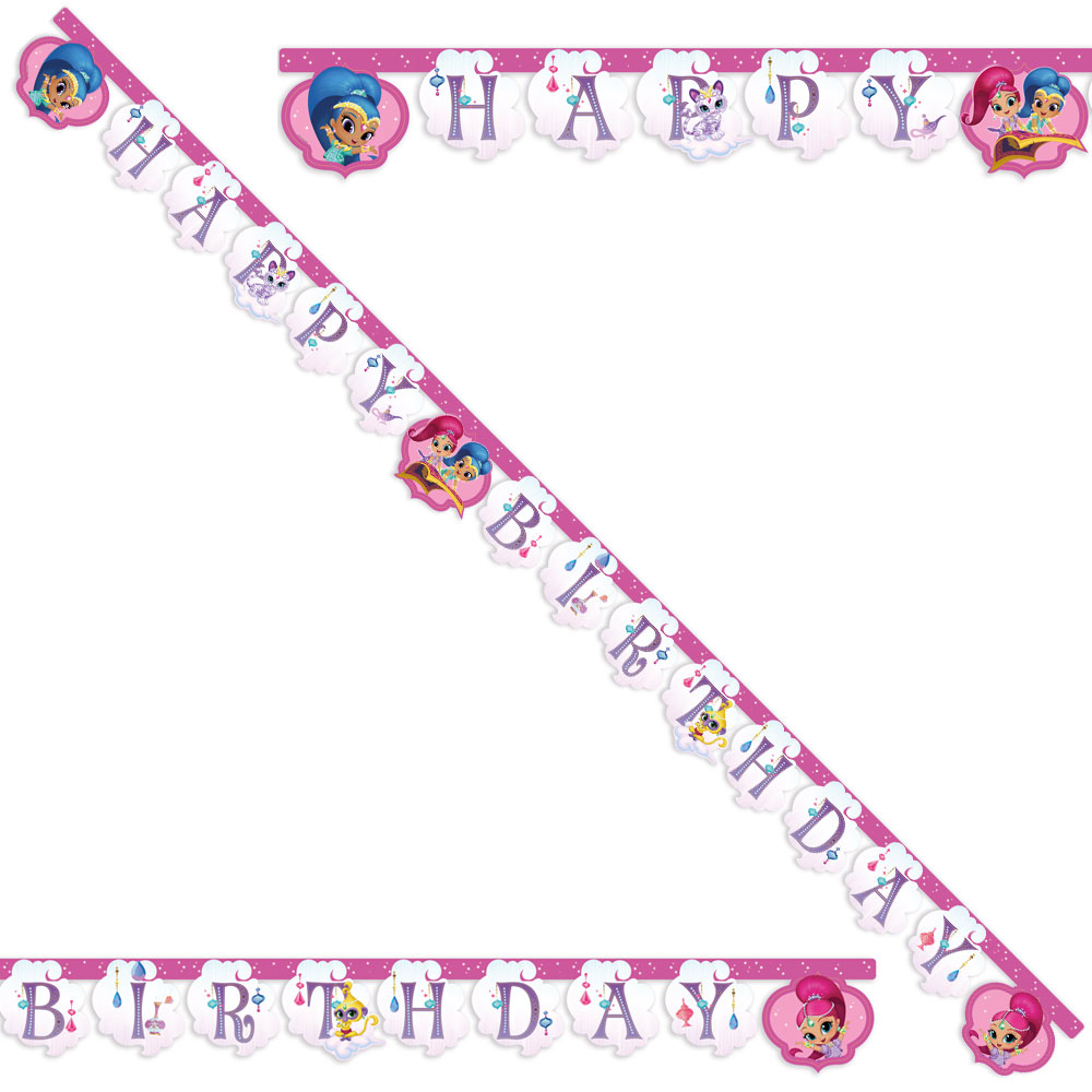Shimmer och Shine Glitter Friends Happy Birthday Girlang består av en rosa och lila banderoll med 3 olika bilder på systrarna Shimmer och Shine, samt texten "Happy Birthday". Bilderna och bokstäverna sitter på ett vitt snöre som även kan underlätta vid upphängning. Tillverkad i papp.