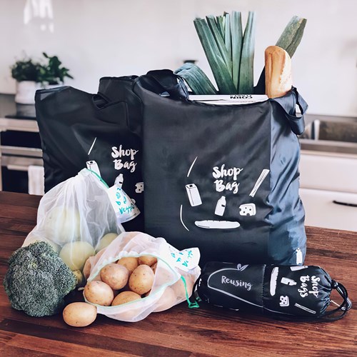 Material: Bärkassar av återvunna PET-flaskor, nätpåsar av livsmedelsgodkänd 100% polyester.