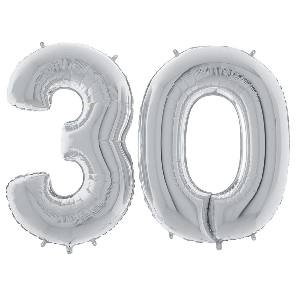 Sifferballong 30 Silver omfattar två silvriga sifferballonger av folie i siffrorna 3 och 0. Ballongerna mäter ca 100 cm och fylls med luft eller helium.