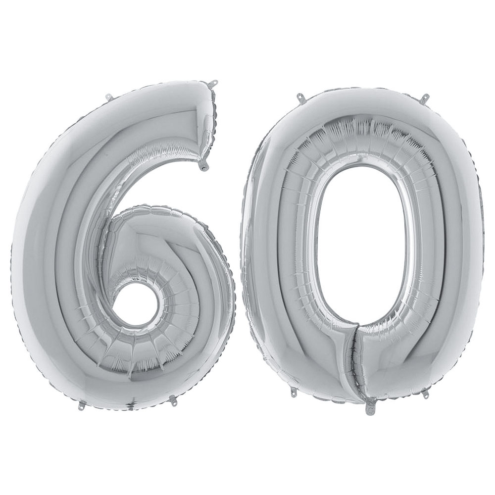 Sifferballong 60 Silver omfattar två silvriga sifferballonger av folie i siffrorna 6 och 0. Ballongerna mäter ca 102 cm och fylls med luft eller helium.