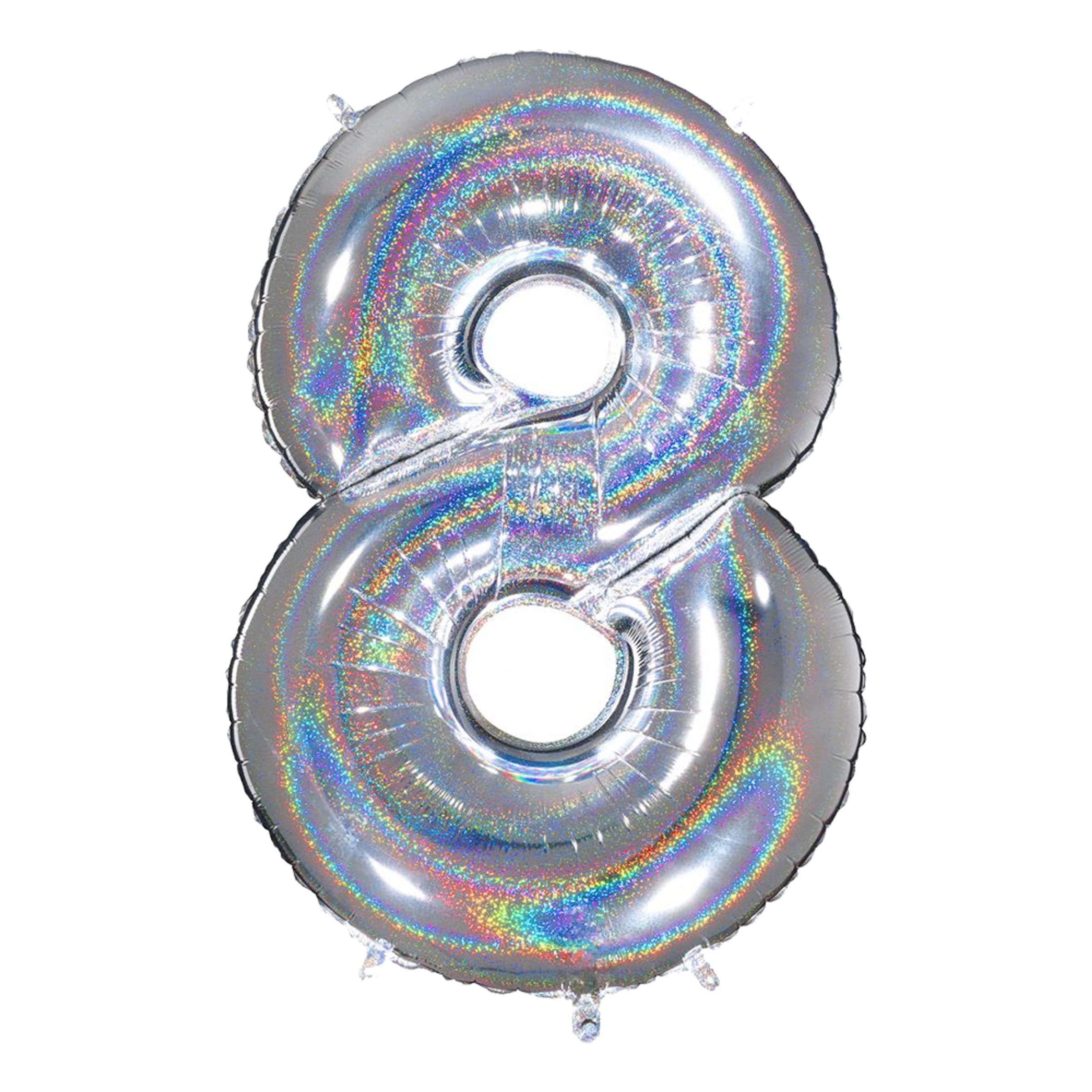 Sifferballong Silver Glitter säljs styckvis och finns i siffrorna 0 till 9. Varje siffra skiner i olika glittriga nyanser med en grundfärg av metallicguld. Varje sifferballong mäter hela 102 cm stor och passar lika bra till 1-årskalaset som till 100-årskalaset.