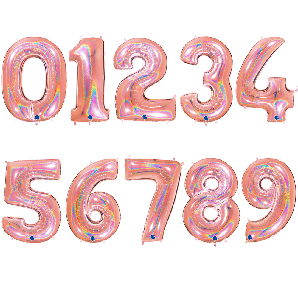 Sifferballong Holografisk Roseguld består av en ballong i form av olika siffror i snyggt glittrigt roseguld. Ballongerna har även små öglor där ett ballongsnöre enkelt kan fästas.