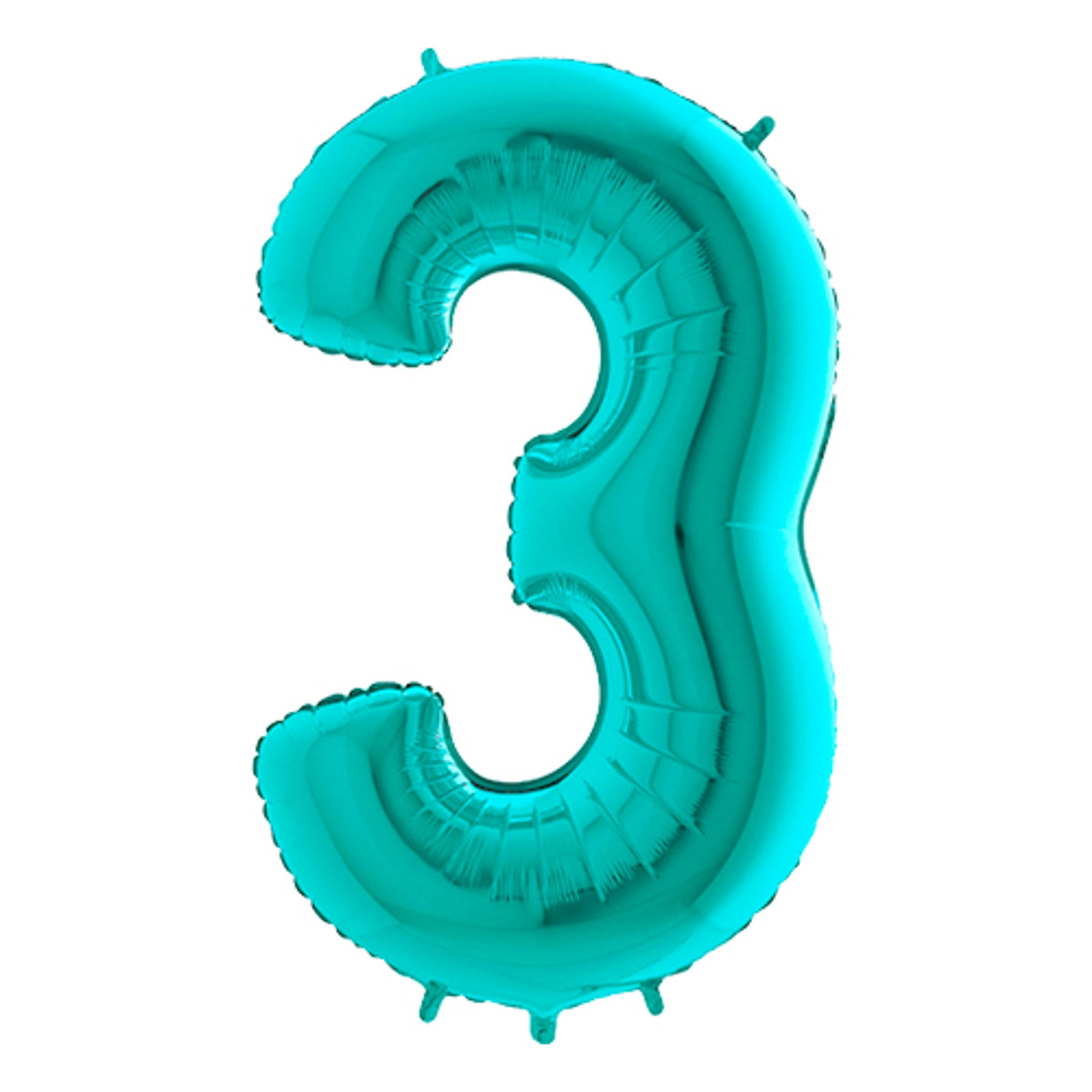 Sifferballong Turkos Metallic är tillverkad av plastfolie och har en blank och snygg turkos färg. Fyll ballongerna med helium för att få dem att sväva.