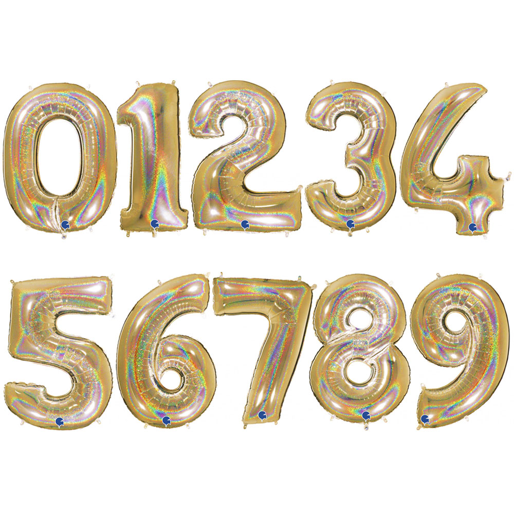 Sifferballonger Holografiskt Glitter Guld omfattar holografiska sifferballonger i guld som finns att välja mellan siffrorna 0-9.