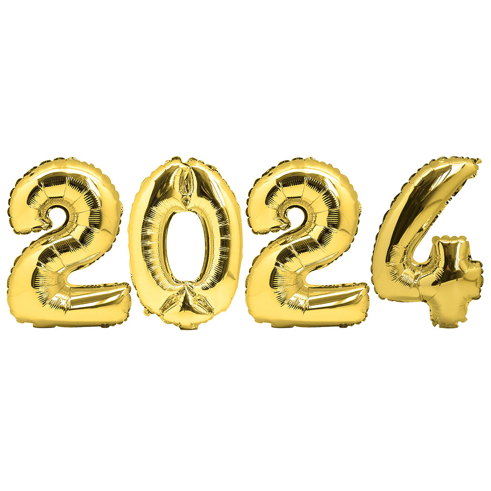 Sifferballonger Nyår Guld 2024 omfattar fyra stycken folieballong i guld som bokstaverar "2024". Ett rör i papp för uppblåsning medföljer.