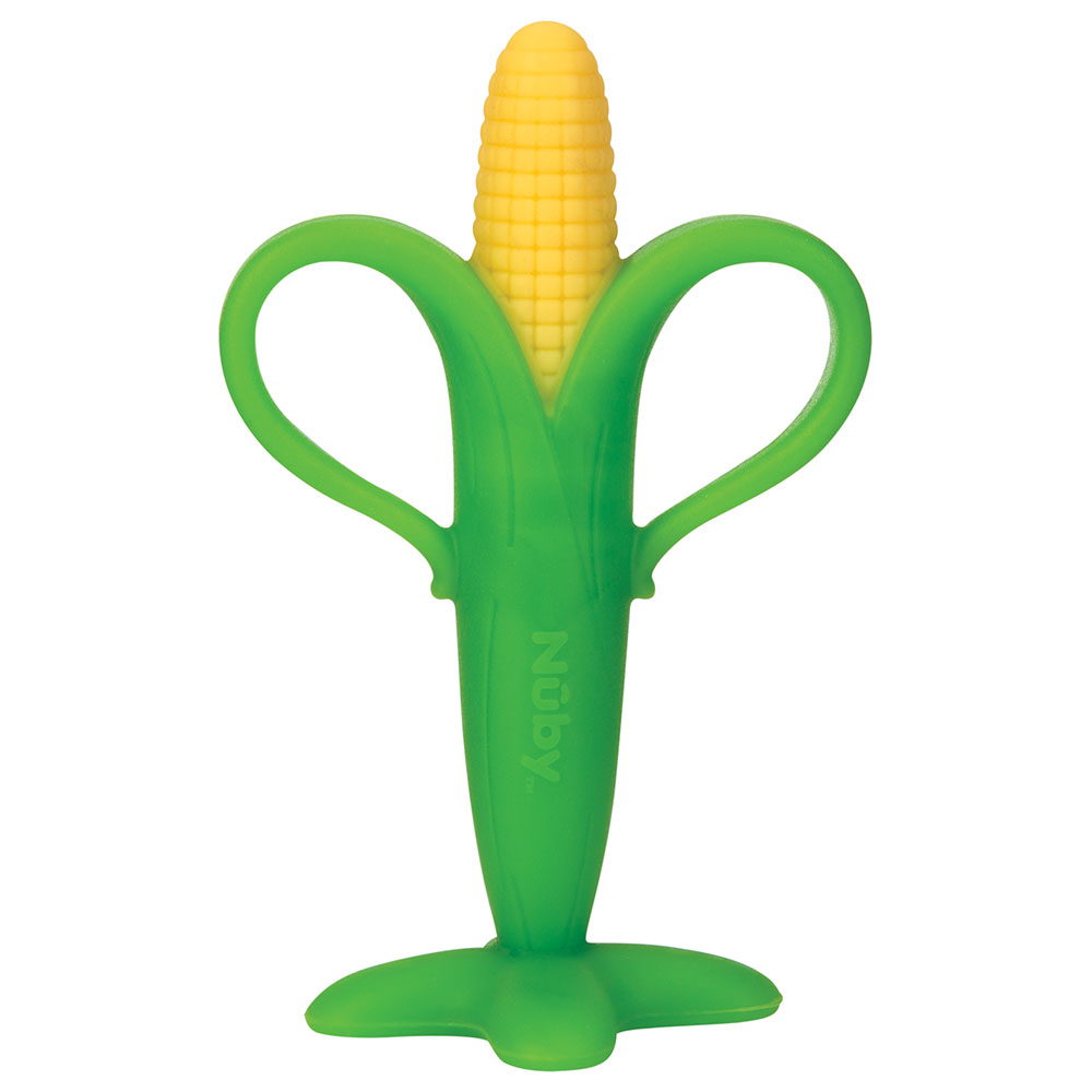 Silikon Bitleksak Majs omfattar en bitleksak i form av en gul och grön majs.