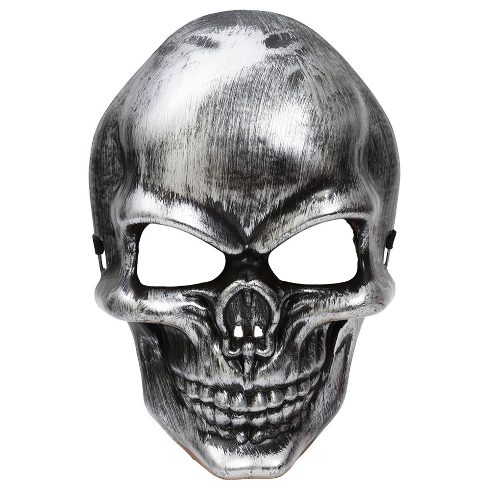 Silver Döskalle Mask omfattar en mask i silvrig plast som föreställer en döskalle. Masken fästs med ett resårband runt huvudet.