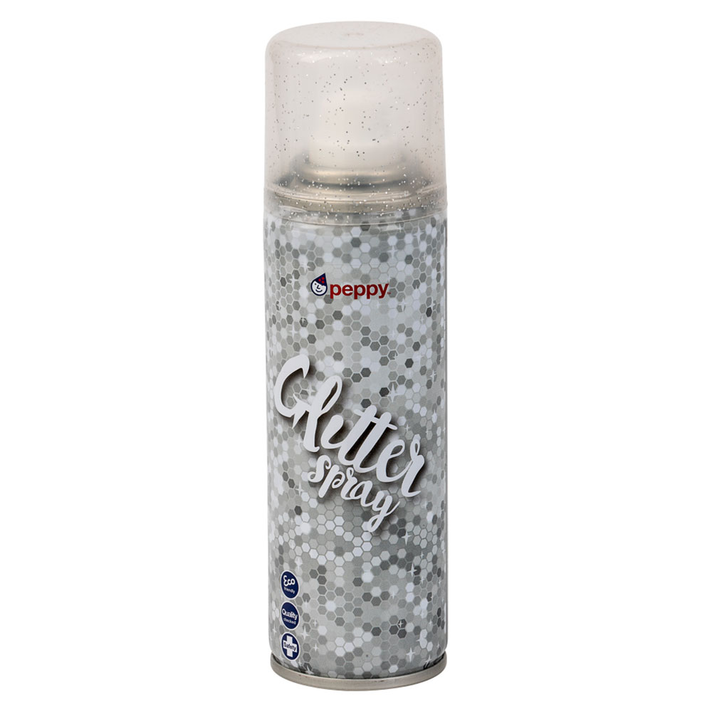 Silver Glitter Hårspray innehåller en vattenbaserad hårspray i silvrigt glitter.