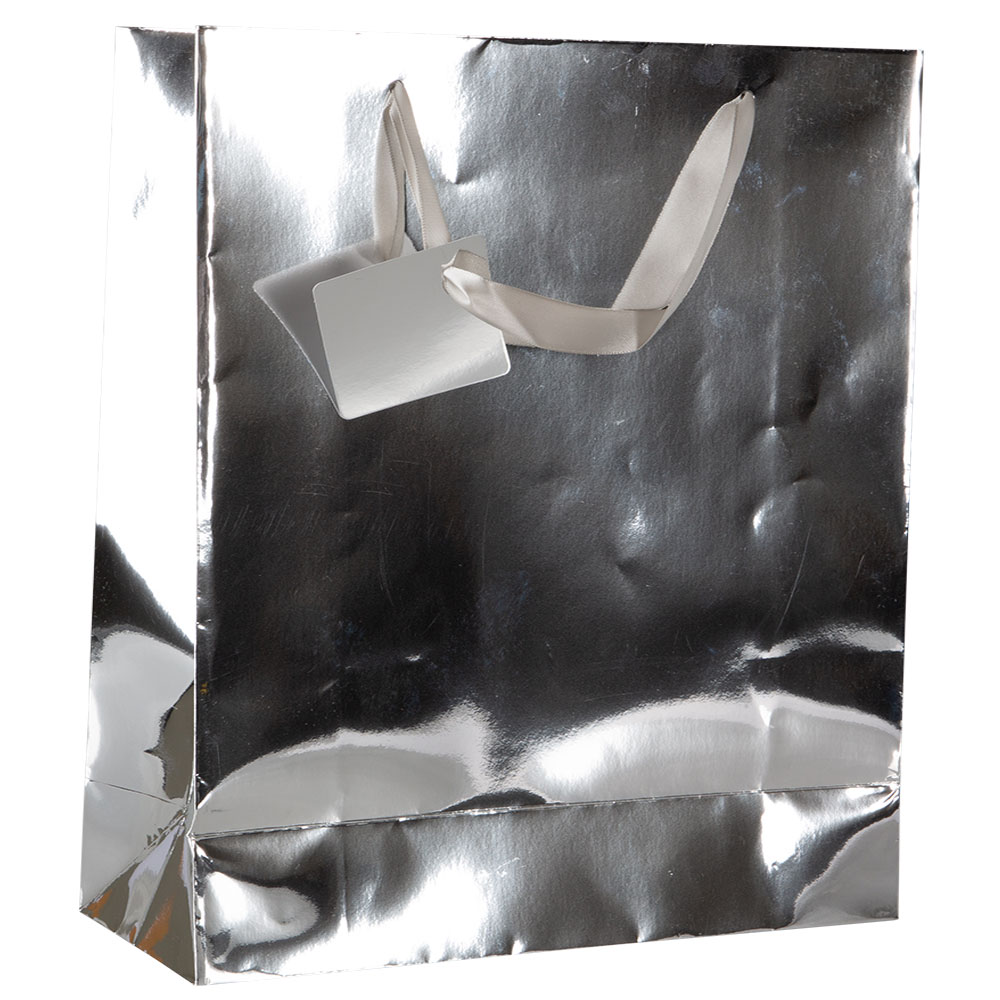 Silvrig Presentpåse Stor omfattar en glansig presentpåse i silver med dekorativa handtag av matchande band. Påsen är tillverkad i papp och är ca 35 cm hög, 27 cm bred samt 11 cm djup.