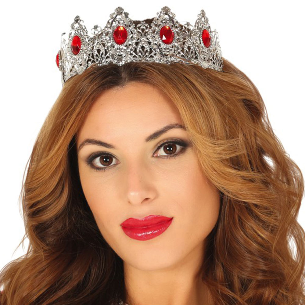 Silvrig Tiara med Röda Juveler omfattar en silvrig tiara med fem röda plastjuveler.