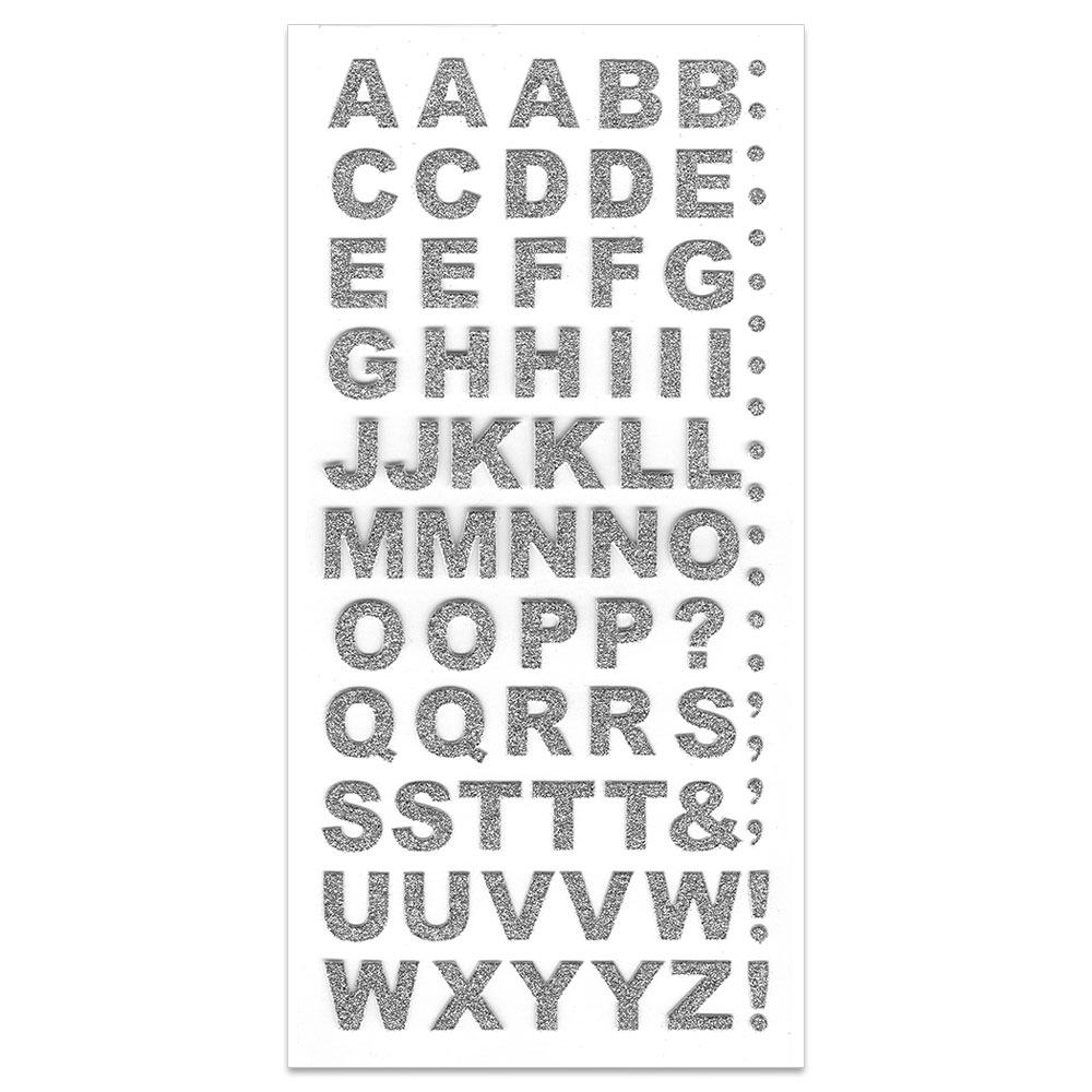 Få till skimrande små ord eller texter i glittrande silver med dessa fina klistermärken i form av olika bokstäver och tecken. Riktigt fina stickers bokstäver som passar perfekt till alla olika sorters pyssel. Utmärkta klistermärken för alla som vill dekorera med glittriga ord på ett enkelt och snabbt sätt.