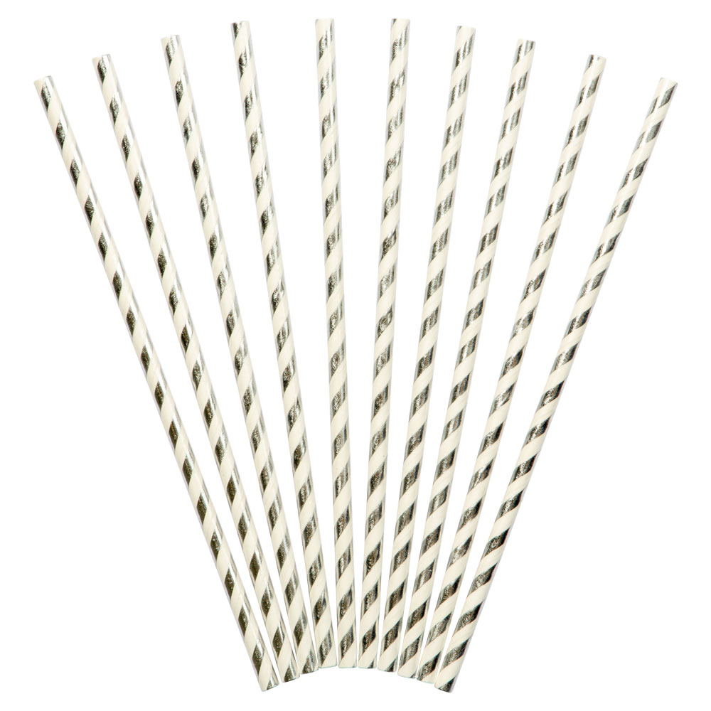 Silvriga Sugrör Randiga omfattar 10 st pappsugrör med ränder i vitt och silver. Sugrören mäter ca 19,5 cm långa.