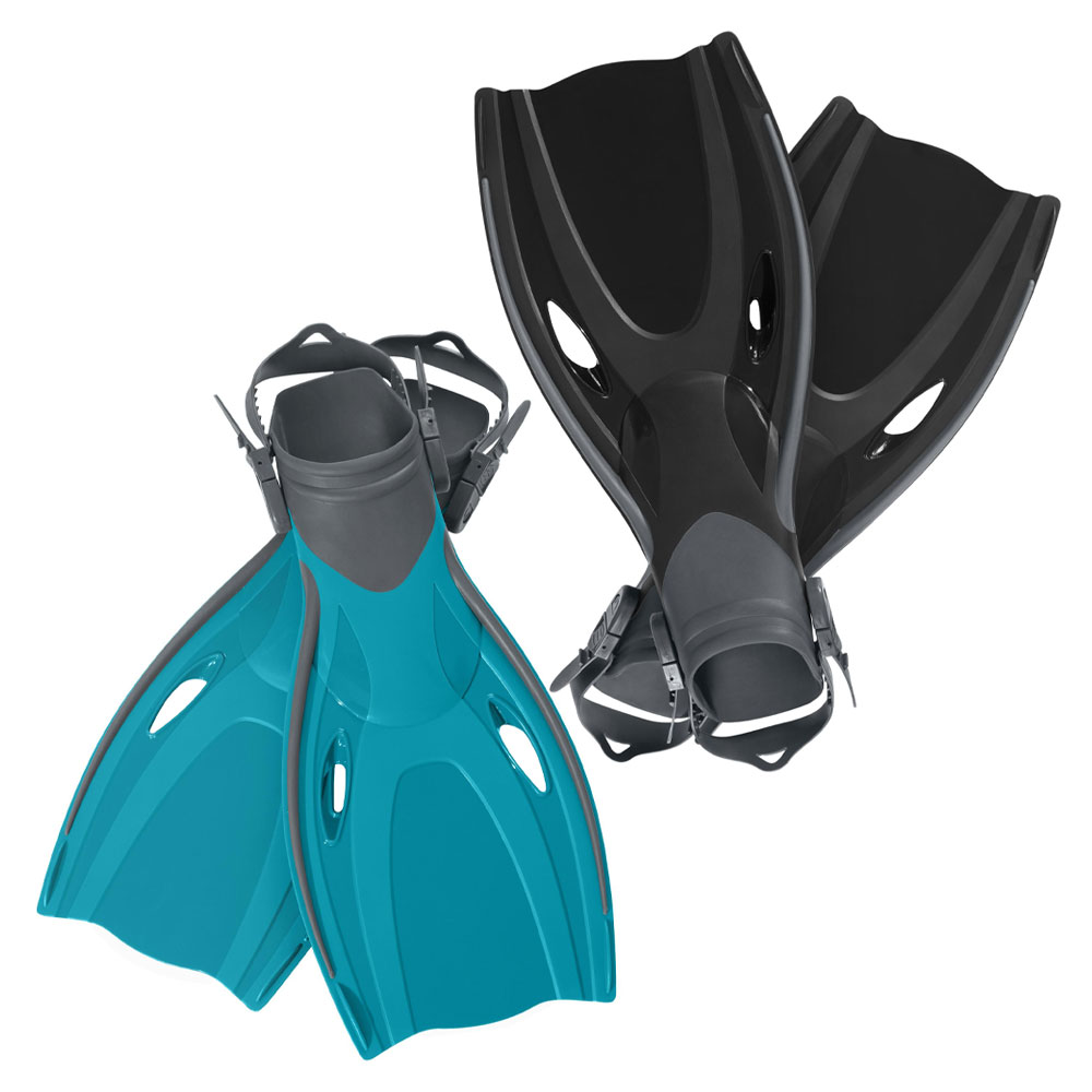 Ge dig ut och upptäck livet under vattenytan med ett par simfötter! Med simfötter blir du en extra bra simmare redo för olika vattenäventyr. Dessa swim flippers har smart antihalk skydd och knapp för att enkelt få av dig simfötterna, perfekt för alla vuxna som vill simma extra bra under semestern.