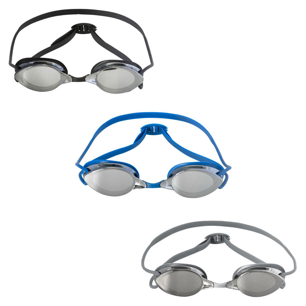 Simglasögon med Spegelglas omfattar ett par simglasögon för äldre barn från ca 14 år och äldre. Simglasögonen har spegelglas med UV-filter och anti-dimbeläggning samt mjuk silikon vid ögonen och justerbar silikonrem. Finns i olika färger, vilken du får blir en överraskning.