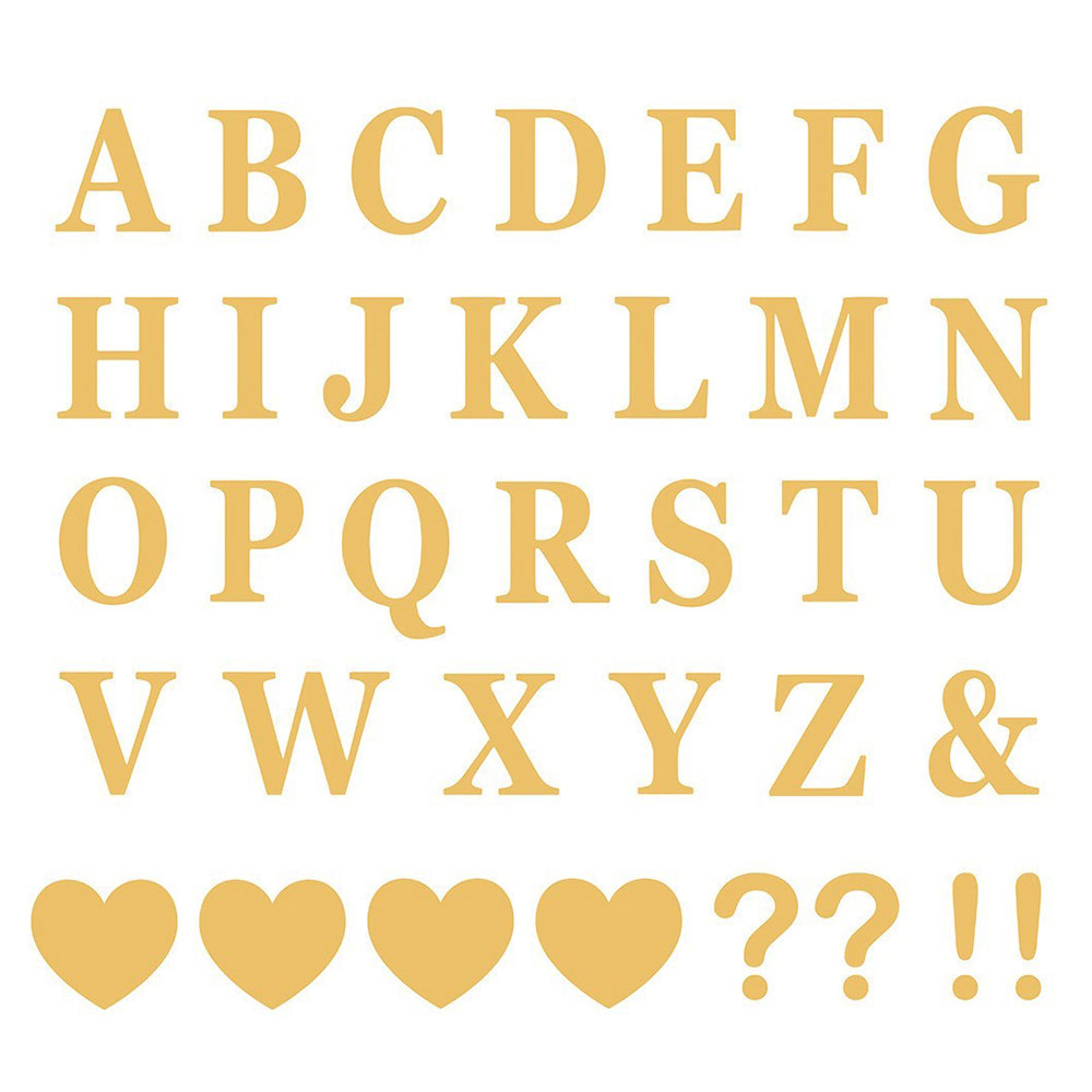 Förvandla dina projekt med klistermärken i form av bokstäver i guld. Dessa självhäftande bokstäver, tillsammans med hjärtan och utvalda tecken, ger oändliga möjligheter för personliga skapelser, presenter eller inredningsdetaljer. Utforska kreativitet utan begränsningar.