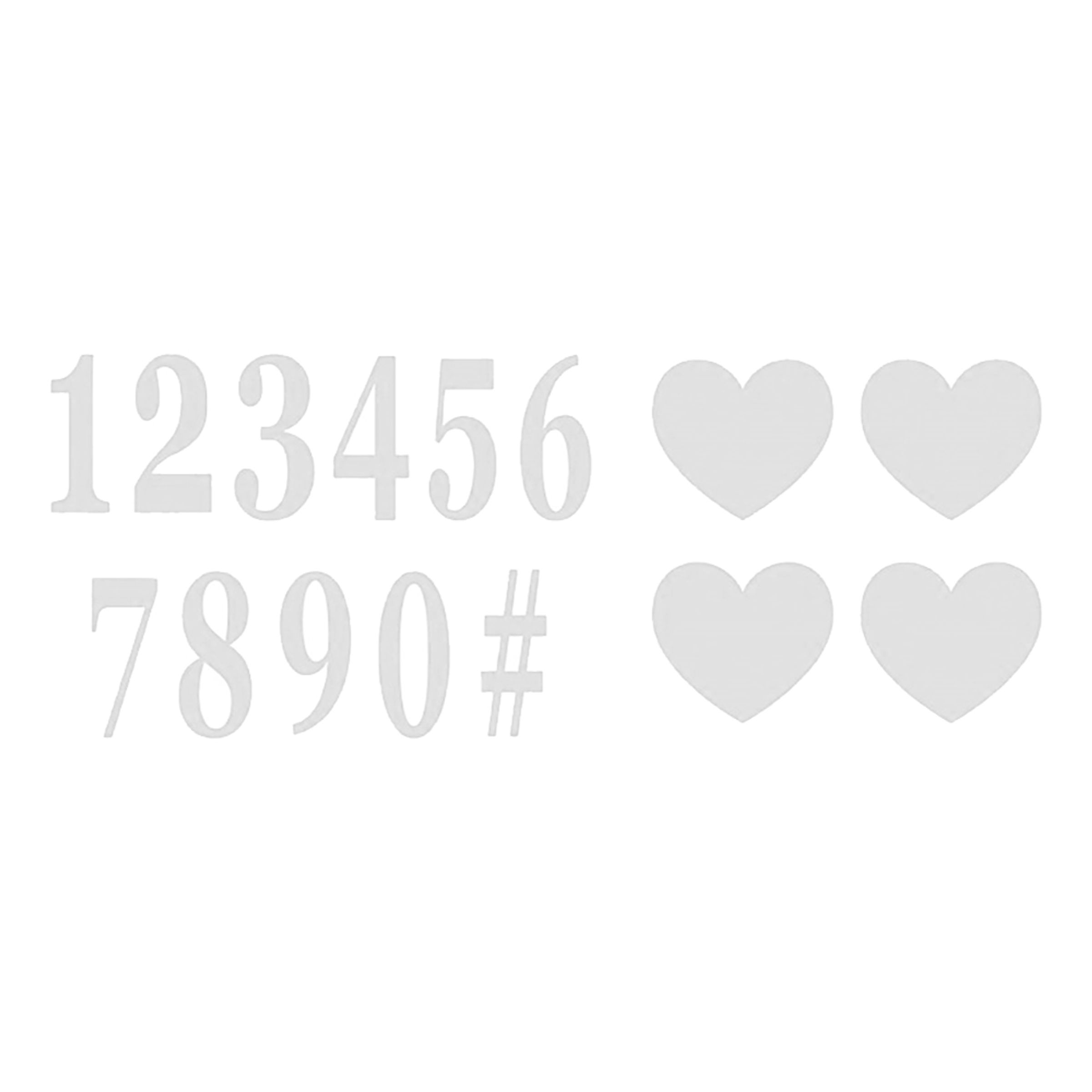 Självhäftande Siffror & Tecken Vit kommer med bokstäverna 0-9, #, samt fyra hjärtan i vitt som fäster på de flesta ytor.