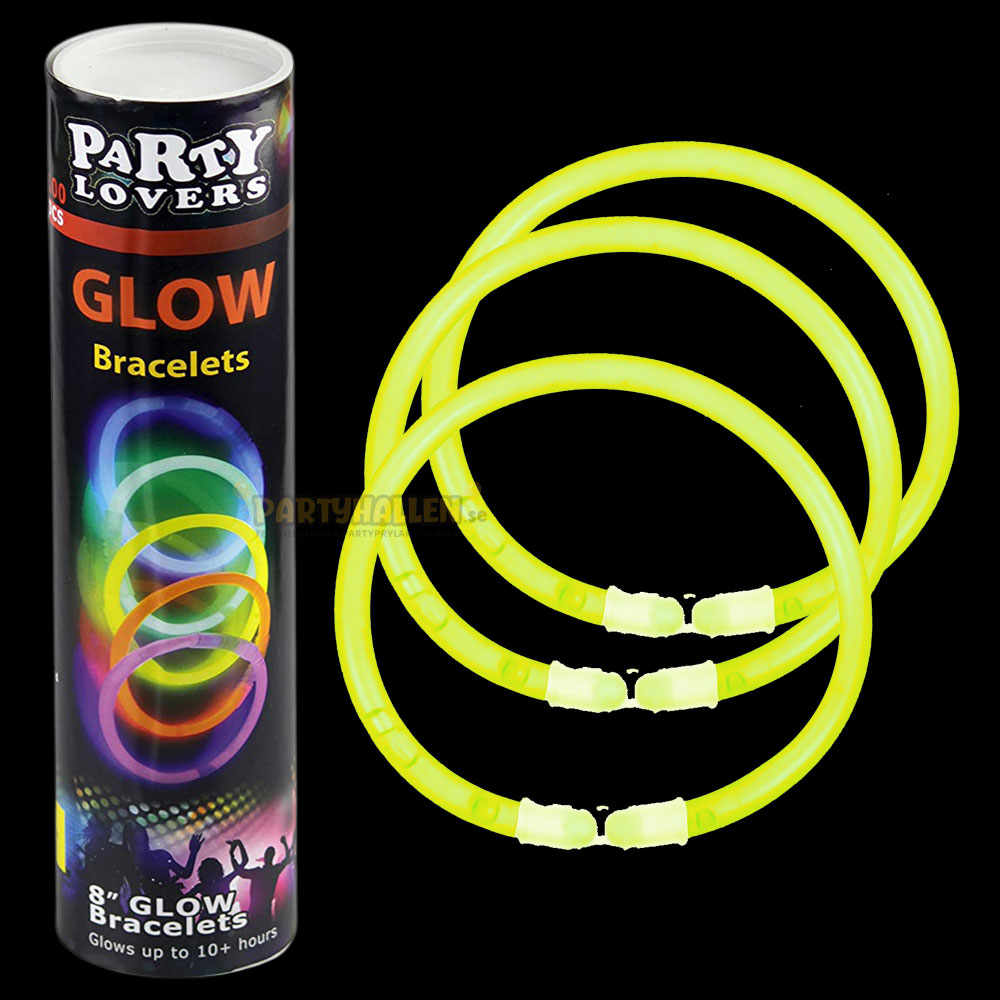 Självlysande Armband Gul omfattar ett 100-pack självlysande armband i gult. Armbanden aktiveras genom en enkel böjning och lyser i ca åtta timmar. Armbanden är ca 20 cm långa.