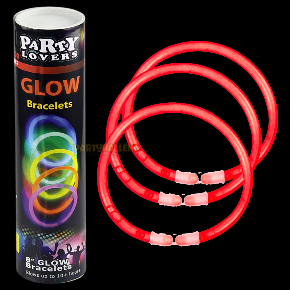 Självlysande Armband Röd omfattar ett 100-pack självlysande armband i rött. Armbanden aktiveras genom en enkel böjning och lyser i ca åtta timmar. Armbanden är ca 20 cm långa.