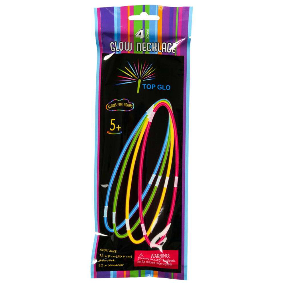 Självlysande Halsband omfattar en förpackning med 4 st glowsticks i färgerna blå, grön, gul och rosa som kan lysa i flera timmar. Aktiveras enkelt genom att böja, vifta eller skaka och sedan montera ihop ringen.
