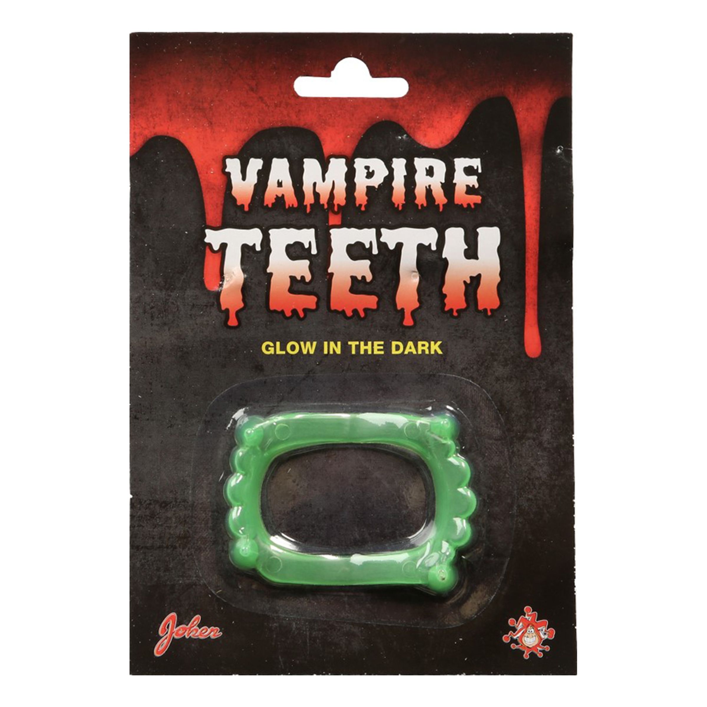 Självlysande Huggtänder för Barn är en uppsättning självlysande löständer för under och överkäke. Tänderna sätts enkelt över dina egna tänder och de sitter ihop med varandra.