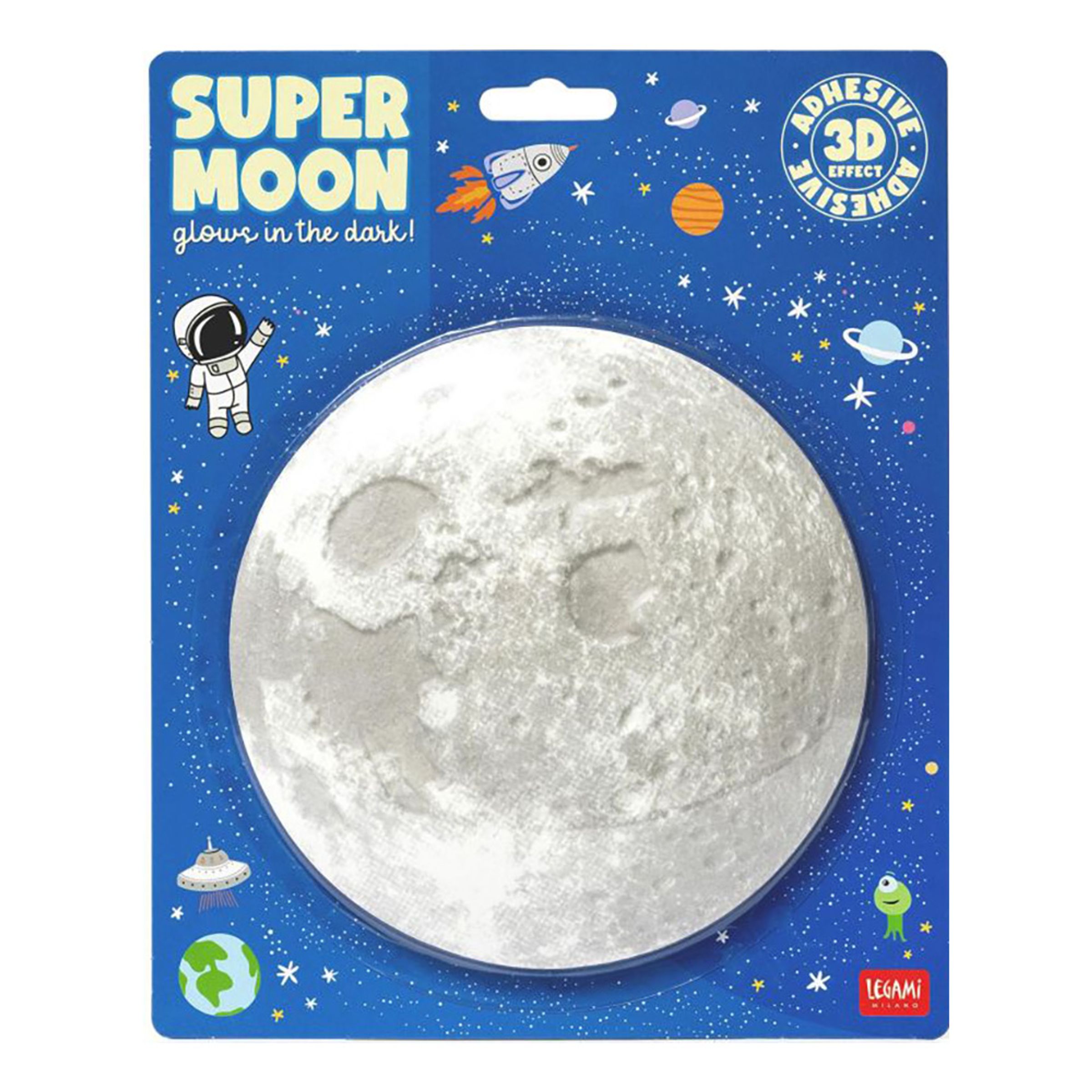 Självlysande Måne Väggsticker är en självhäftande och självlysande måne med klister på baksidan. Månen laddas av dagsljus och lyser sedan i mörker med en läcker 3D-effekt. Med den här supermånen kan du skapa din alldeles egna stjärnhimmel ovanför sängen.