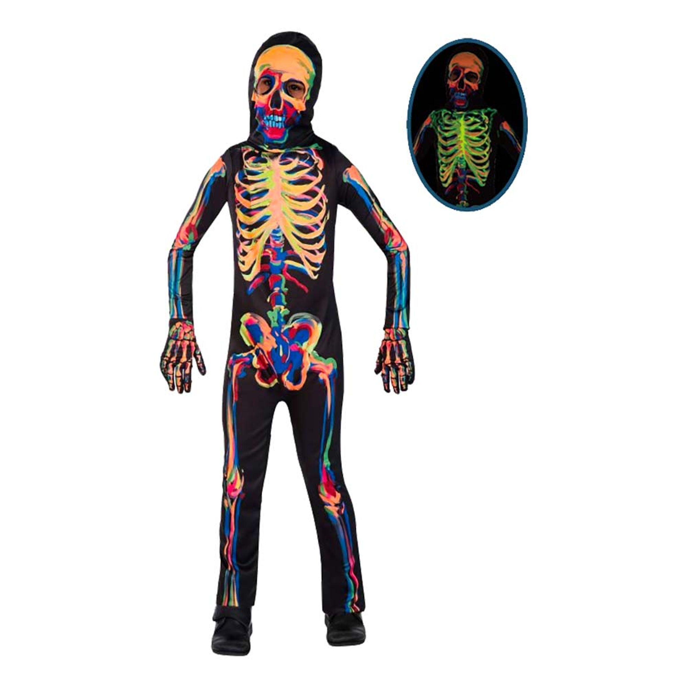 Självlysande Skelett Barn Maskeraddräkt inkluderar en svart overall med flerfärgat skelettmotiv på framsidan, en matchande skelettmask i tyg och ett par skeletthandskar. Motiven blir självlysande i mörkret efter att ha exponerats för ljus/belysning, vilket gör dräkten otroligt effektfull och klockren som halloweendräkt! Observera att jumpsuiten inte har något skelettryck baktill.