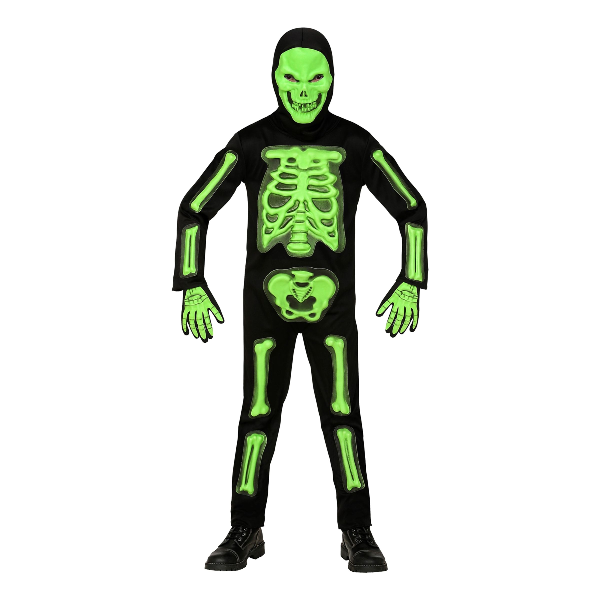 Självlysande Skelett Barn Maskeraddräkt är en svart jumpsuit med motiv av ett skelett i 3D, en matchande mask med huva samt ett apar handskar. När rummet släcks ner lyser skelettet, masken och handskarna upp!
