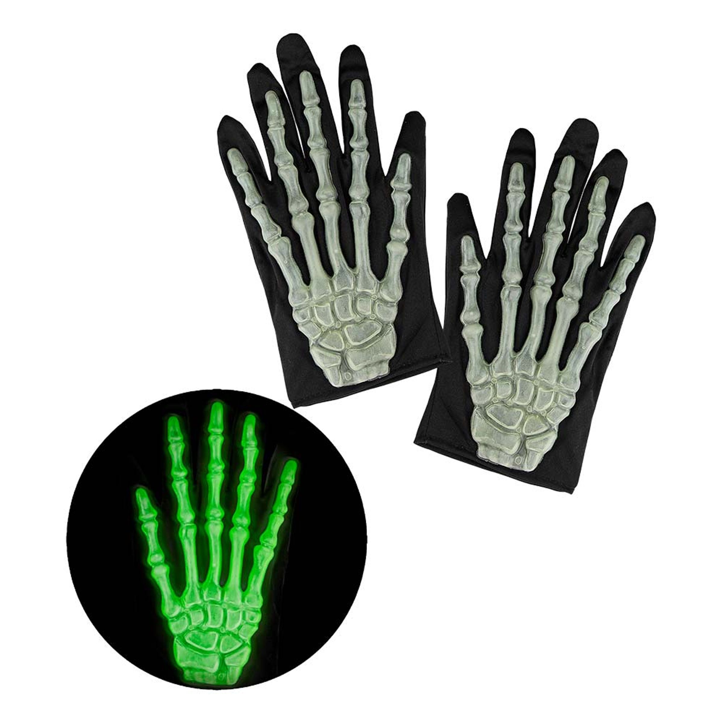 Självlysande Skeletthandskar för Barn är ett par tuffa, svarta handskar med utstickande skeletthänder på. I mörkret lyser handskarna upp i en grön färg. Handskarna erbjuds i en storlek som passar barn.