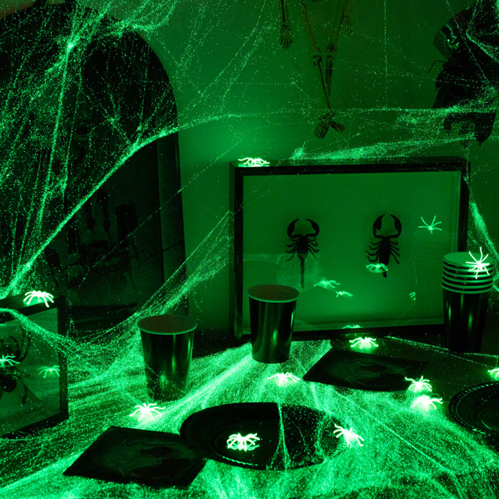 Vill du få till en extra läskig spindelnät dekoration så är detta självlysande spindelnät precis vad du ska ha! Med detta glow in the dark spindelnät får du enkelt till en riktigt skrämmande halloween dekoration. Du får även med åtta stycken läskiga spindlar att fästa i nätet som adderar extra kuslighet. Perfekt spindelväv till alla spökhus!