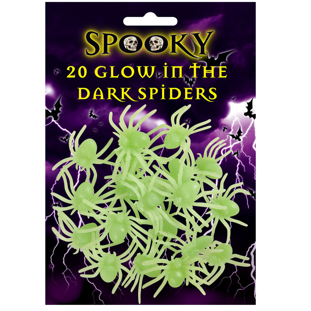 Självlysande Spindlar Dekoration består av 20 stycken självlysande spindlar som blir en utmärkt dekoration till Halloween festen.