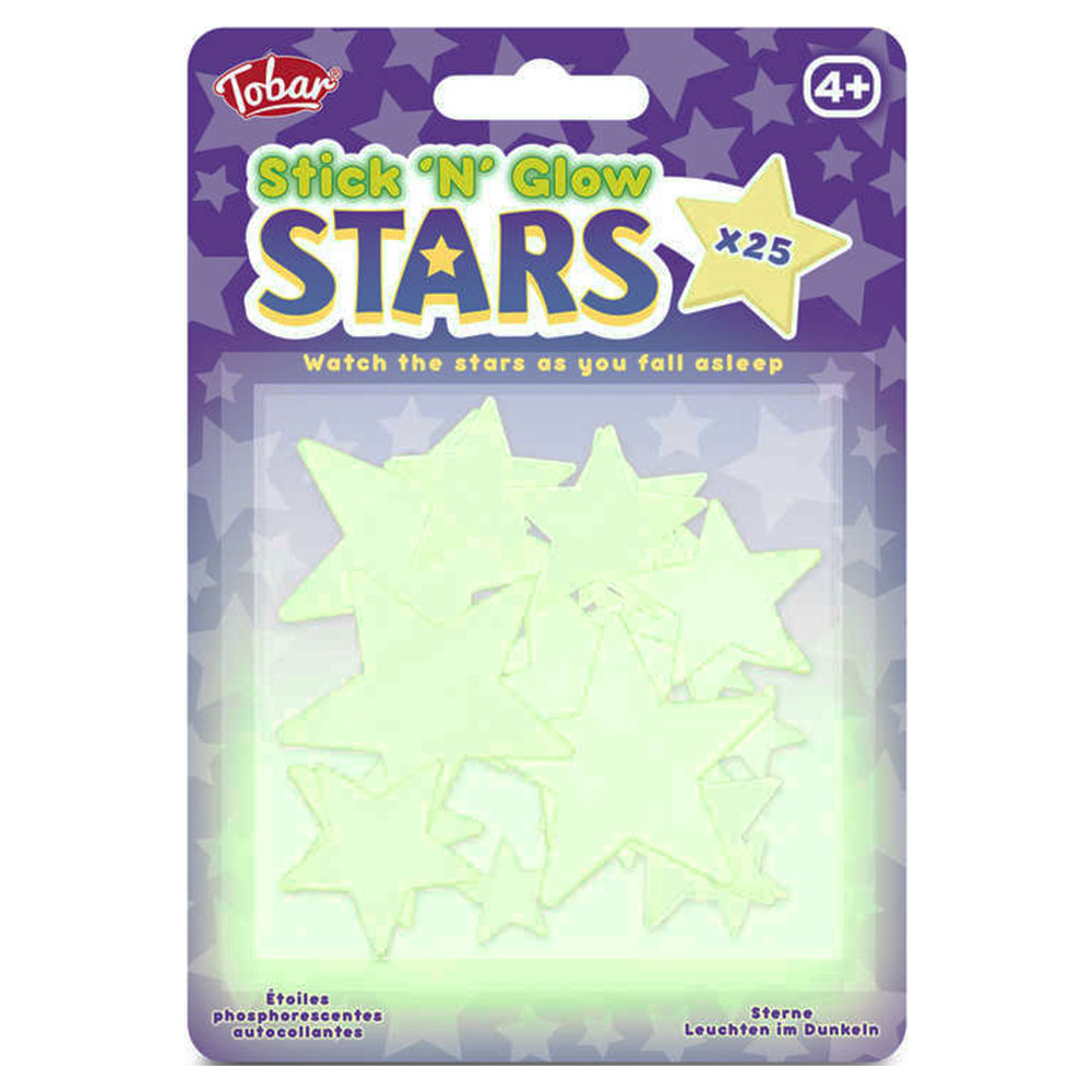Självlysande Stjärnor 25-Pack omfattar självlysande dekorationer i form av stjärnor i olika storlekar. Fäst dekorationerna i taket eller på väggen med de medföljande klisterlapparna. Dekorationerna måste laddas med ljus för att de ska lysa i mörkret.
