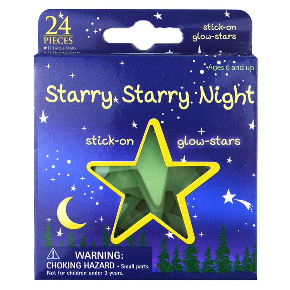 Självlysande Stjärnor Klassiska omfattar ett gula, självlysande stjärnor av plast. De är ca 4,5-8 cm stora och fästs i taket eller på väggarna med medföljande fästkuddar. Ladda dem med solljus eller ljus från en lampa eller en stund för att få dem att lysa i mörker. Kommer i 24-pack.