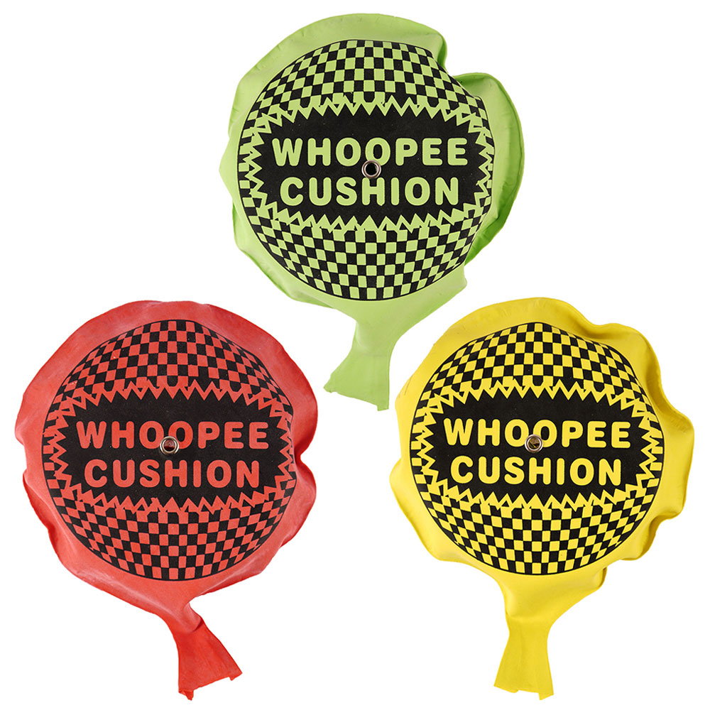 Självuppblåsande Pruttkudde omfattar en pruttkudde som blåser upp sig själv och den har ett svart, rutigt mönster med texten 'Whoopie Cushion'. Pruttkudden finns i färgerna röd, gul och grön men de säljs osorterade och styckvis så det blir en överraskning vilken färg du får.