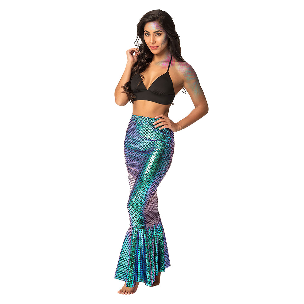 En glänsande blank kjol som för tankarna till en riktig sjöjungfru, perfekt för alla vuxna som ska på maskerad och kalas med mermaid tema. En festlig kjol i blått med volang och svarta detaljer som får din kjol att se ut som skimrande fiskfjäll, perfekt mermaid skirt till en riktigt snygg sjöjungfru utklädnad för ett extra roligt party och sjöjungfru-kalas.