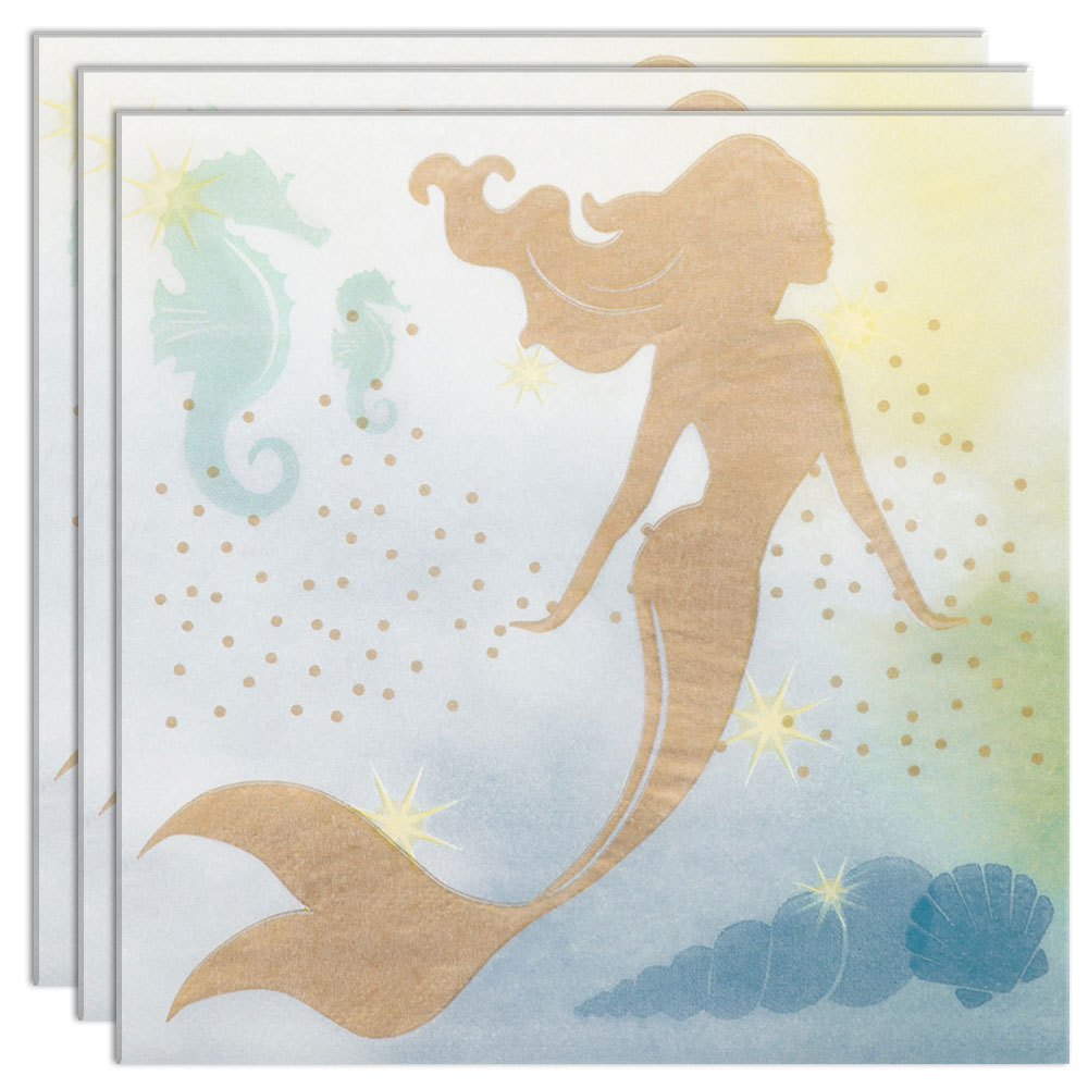 Sjöjungfru Servetter omfattar servetter med motiv av en sjöjungfru i guld på en bakgrund i blått, turkost, grönt och gult med motiv av sjöhästar, snäckor, stjärnor och prickar. Servetterna har tre lager papper och är ca 33 x 33 cm utvikta. Säljs i 20-pack.