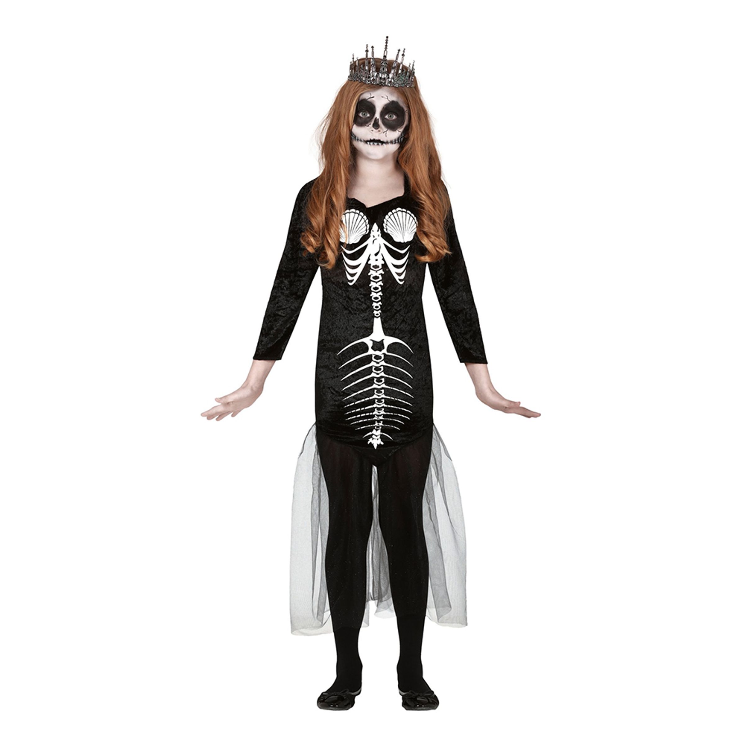 Sjöjungfru Skelett Barn Maskeraddräkt innehåller en svart dräkt i polyester med skeletttryck. Finns i storlekarna Small (5-6 år), Medium (7-9 år) och Large (10-12 år). Krona, skor och smink medföljer ej.