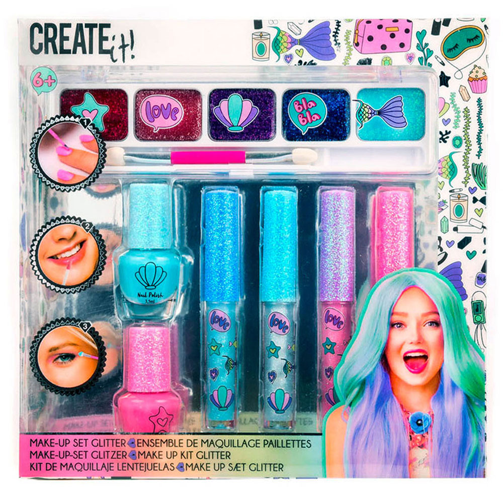 Sjöjungfru Sminkset Barn omfattar en ögonskuggspalett med fem stycken glittriga ögonskuggor, två stycken nagellack i rosa och ljusblått samt fyra stycken läppglans i rosa, lila och två olika nyanser av blått.