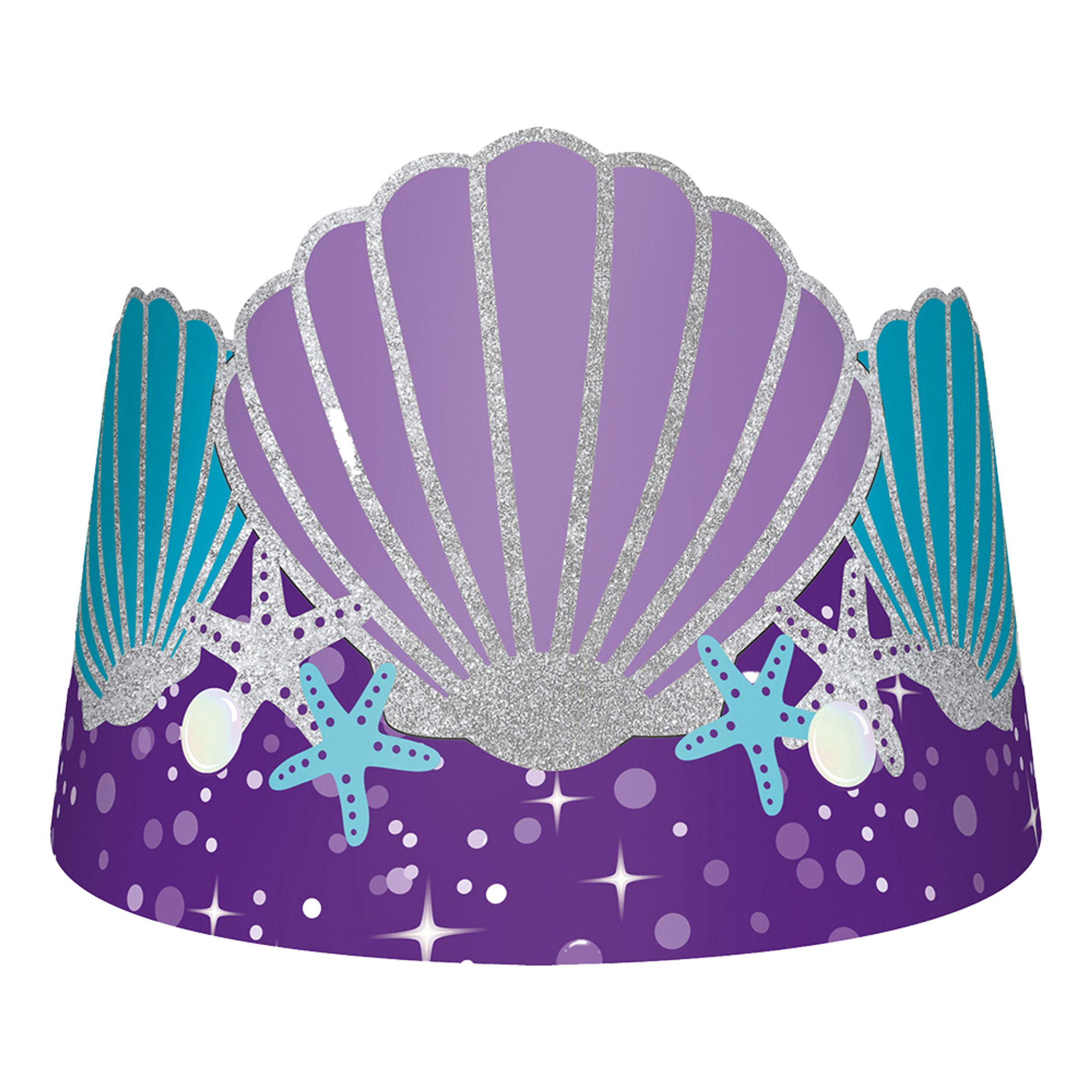 Sjöjungfru Tiaror i Papp är åtta stycken tjusiga tiaror med motiv av stora snäckor och sjöstjärnor i lila och turkos med silverglittriga detaljer, som gör de riktigt läckra. Perfekta till barnkalaset med sjöjungfrutema.
